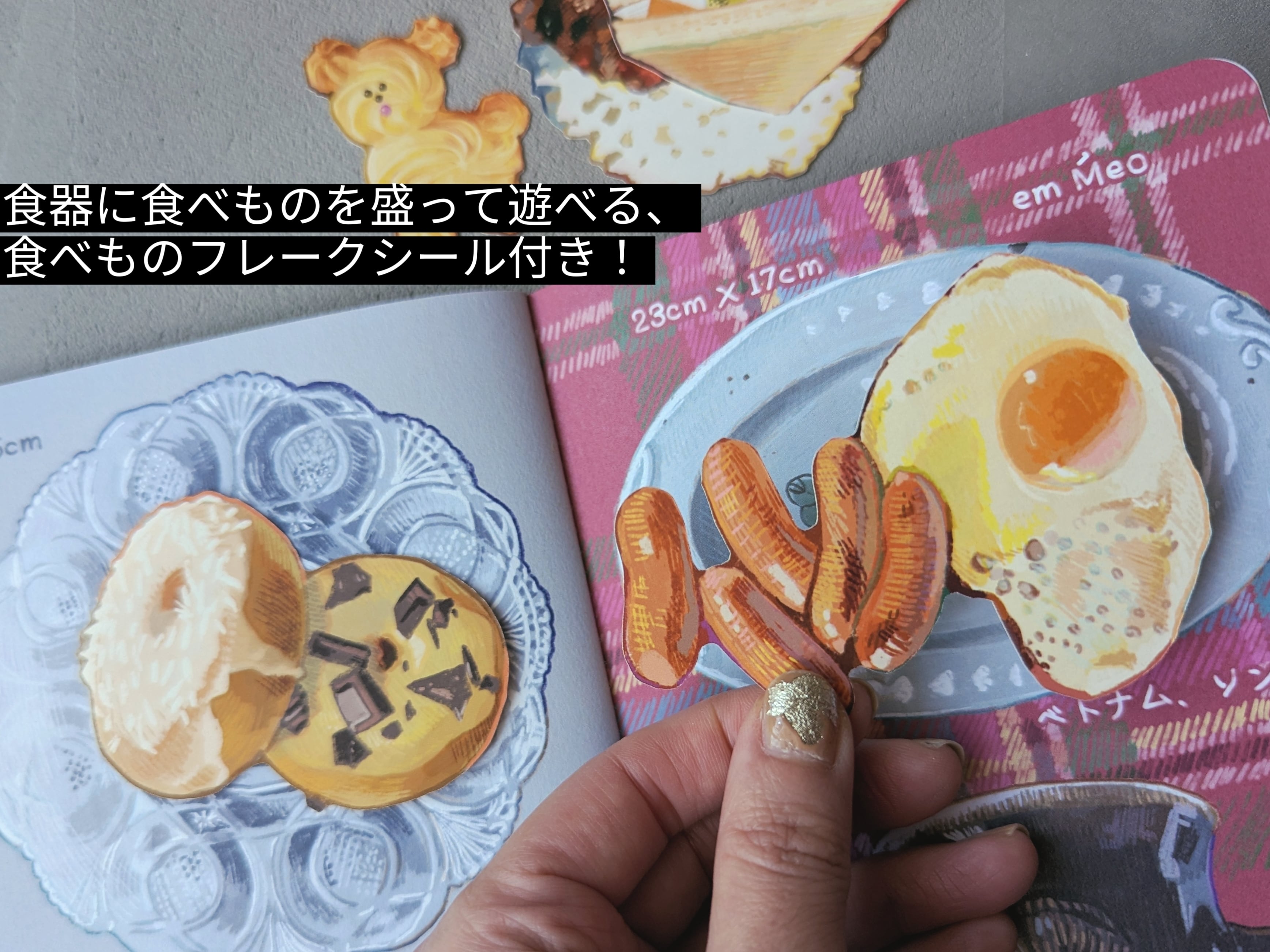 食器の絵に食べものを盛って遊べる、食べものフレークシール付き。